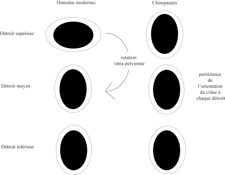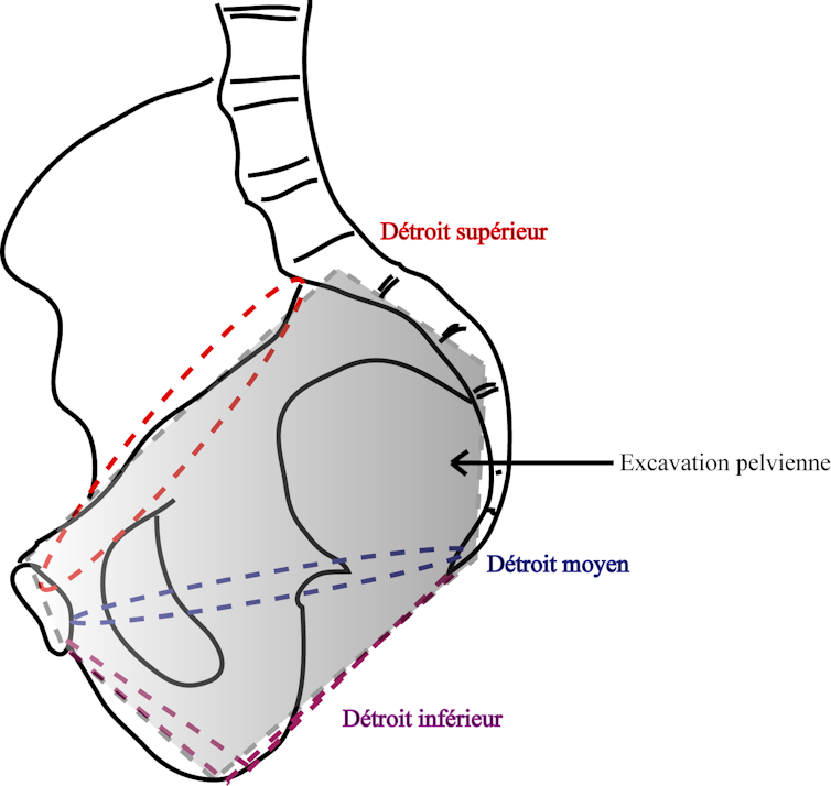 Selon l’hypothèse du dilemme obstétricale, la bipédie à modifié l’architecture pelvienne en réduisant notamment l’espace entre les hanches et le sacrum. Cela a contribué à donner une forme aplatie d’avant en arrière à la partie supérieure du canal d’accouchement.