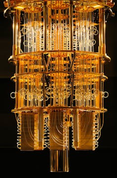 Un cryostat d’IBM, utilisé pour conserver l’ordinateur quantique de 50 qubits – des circuits supraconducteurs – à des températures compatibles avec son fonctionnement. BM/Flickr, CC BY-ND