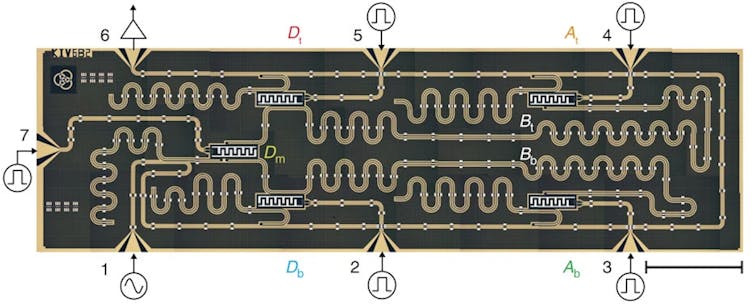 Circuit supraconducteur qui réalise un processeur à trois qubits (barre d’échelle 1 millimètre). D. Ristè et coll, CC BY