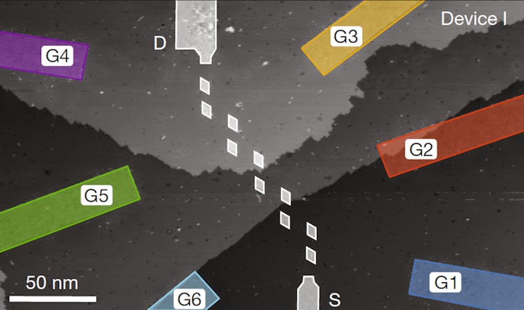 Simulateur quantique d’une molécule de polyacétylène, basé sur des électrons dans le silicium. Kiczynski et coll, CC BY
