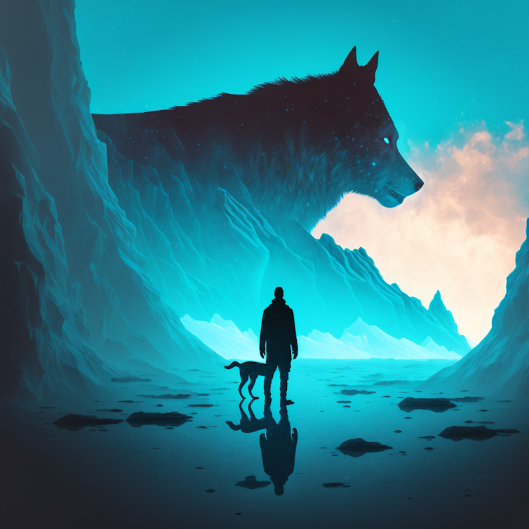 Personne avec son chien regardant le mirage d’un loup au loin. E.-L. Jimenez/Midjourney