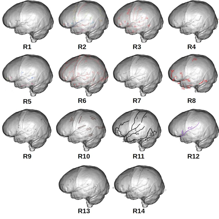 Enfin et surtout, le cœur de l’étude a été de mettre à l’épreuve 14 experts internationaux de domaines variés étudiant l’évolution du cerveau (paléontologues, neurologues et primatologues) et travaillant régulièrement sur les endocrânes. Nous leur avons demandé à partir de l’image de l’endocrâne de positionner les principaux sillons qu’ils ont l’habitude d’observer lors de leur recherche. Puisque nous disposions non seulement de la forme de l’endocrâne mais aussi de celle du cerveau, nous pouvions ensuite vérifier la précision des déterminations effectuées à l’aveugle.