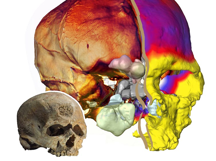 Le fossile original Cro-Magnon 1 et une image virtuelle montrant grâce à l’imagerie la moitié droite de l’endocrâne et la moitié gauche du crâne (le code couleur sur le crâne correspond à la variation d’épaisseur des os). Antoine Balzeau CNRS/MNHN, Fourni par l’auteur
