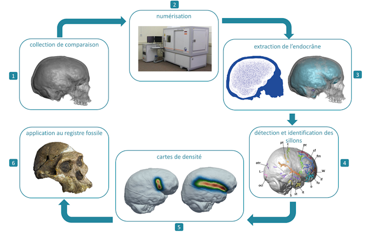À partir de modèles numériques 3D de spécimens fossiles du « Berceau de l’Humanité » et d’un référentiel digital de crânes de primates actuels, nous avons développé et mis à disposition une base de données unique de cartographies pour localiser les principales différences et similitudes entre le cerveau de nos ancêtres et le nôtre. Ces cartographies reposent sur le principe d’atlas traditionnellement utilisé en neuroscience et ont permis à la fois une meilleure connaissance de la variabilité dans la distribution spatiale des sillons du cerveau humain actuel et l’identification des caractéristiques cérébrales chez les fossiles. En effet, certains désaccords scientifiques majeurs dans la discipline sont la conséquence de notre méconnaissance de la variation inter-individuelle, qui entraîne une surinterprétation des différences entre les spécimens fossiles.