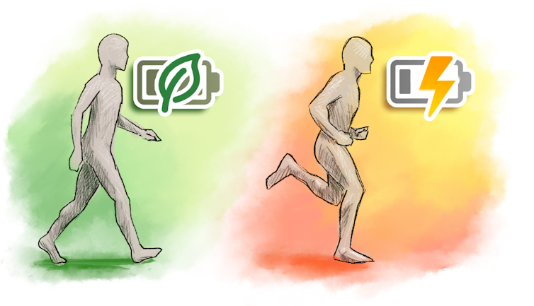 La course à pied implique une oscillation verticale du centre de masse beaucoup plus importante que celle de la marche. C’est la raison principale qui explique que la course à pied est plus énergivore que la marche pour une même distance parcourue. François Dernoncourt, Fourni par l’auteur