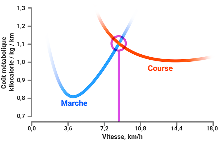 Modélisation du coût métabolique (kilocalories dépensées par kilogramme par kilomètre parcouru) en fonction de la vitesse (kilomètres par heure) pour la marche et pour la course à pied. Les courbes se croisent à une certaine vitesse (ligne violette ; aux alentours de 8 km/h) : cela signifie qu’au-delà de cette vitesse, marcher devient plus énergivore que courir. C’est à peu près à cette vitesse seuil que les individus passent spontanément de la marche à la course. François Dernoncourt, Adapté de Summerside et al, Fourni par l’auteur