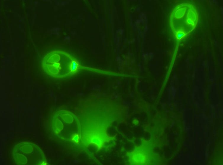 Imagen de microscopía de fluorescencia de esporas del cnidario parásito Henneguya salminicola. Stephen Douglas Atkinson, CC BY-SA