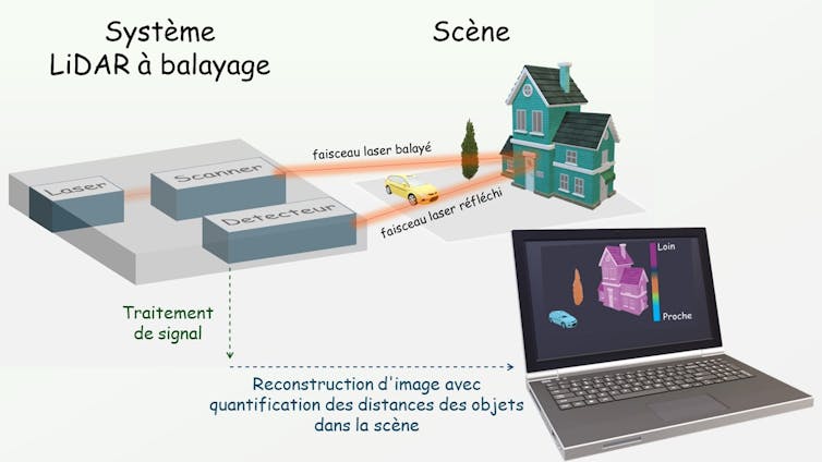 Illustruation d’un système LiDAR. Le laser balaie la scène et le signal réfléchi est traité pour reconstruire un nuage de points. La profondeur de chaque objet est encodée avec différentes couleurs. Christina Kyrou, Fourni par l’auteur