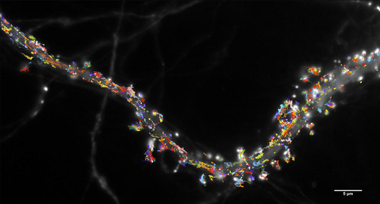 En couleurs, les protéines qui reçoivent les messagers chimiques voyageant entre les neurones. Cette image a été obtenue en associant la microscopie de fluorescence et le suivi de nombreuses molécules individuelles. © Benjamin Compans / Daniel Choquet/IINS/CNRS Photothèque, Fourni par l’auteur