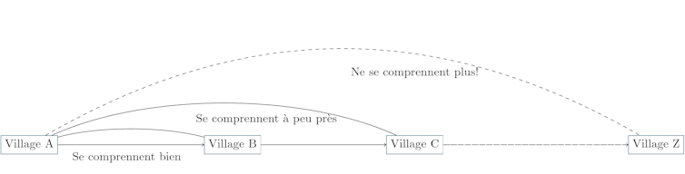Lorsque nous parlons une langue, nous nous mettons d’accord sur les mots que nous utilisons et les règles grammaticales qui vont les organiser dans des phrases. Mais ces mots et ces règles ne sont jamais exactement les mêmes entre deux individus ni entre deux groupes. Cette variation a pour résultat de faire changer les langues, et d’en créer des nouvelles. Par exemple : prenons le village A, qui parle une langue. Le village B, qui est juste à côté, parle presque la même langue, avec peut-être quelques mots qui changent. Le village C, un peu plus loin, parle une langue similaire, mais avec certaines règles qui diffèrent… Et ainsi de suite, jusqu’au village Z, qui est si loin du village A qu’ils ne se sont jamais rencontrés, et qu’ils parlent une langue si différente qu’ils ne se comprendraient pas !