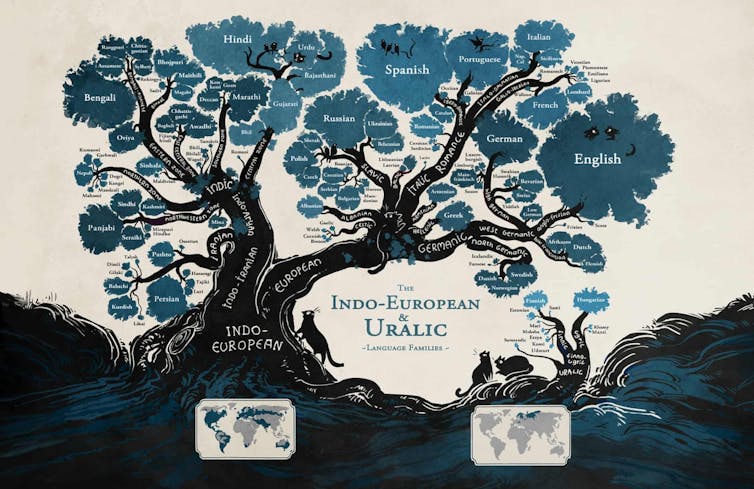 Cette variabilité fondamentale du langage nous donne l’immense nombre de langues qui s’est développé au cours de l’Histoire : aujourd’hui, on les estime à environ 7000 dans le monde – un nombre qui malheureusement décline, à cause d’un phénomène contemporain d’extinction des langues. Chacune de ses langues s’inscrit dans une famille, avec des « frères et sœurs » contemporains (par exemple, le français, l’italien et l’espagnol) et un parent antérieur (le latin). Au XIXe siècle, les linguistes et anthropologues firent une découverte majeure sur les plus de 200 langues parlées en Europe. Une grande partie de celles-ci seraient issues d’une langue commune et très ancienne, répandue en Eurasie : l’indo-européen ! Au fur et à mesure des années, et avec les mouvements de populations qui se sont séparés dans des pays de plus en plus éloignés, l’indo-européen s’est subdivisé en plusieurs familles et sous-familles : parmi les plus connues, les langues slaves (russe, tchèque, croate), celtiques (gaélique, gallois, breton), germaniques (allemand, anglais, scandinave), romanes, et bien d’autres.